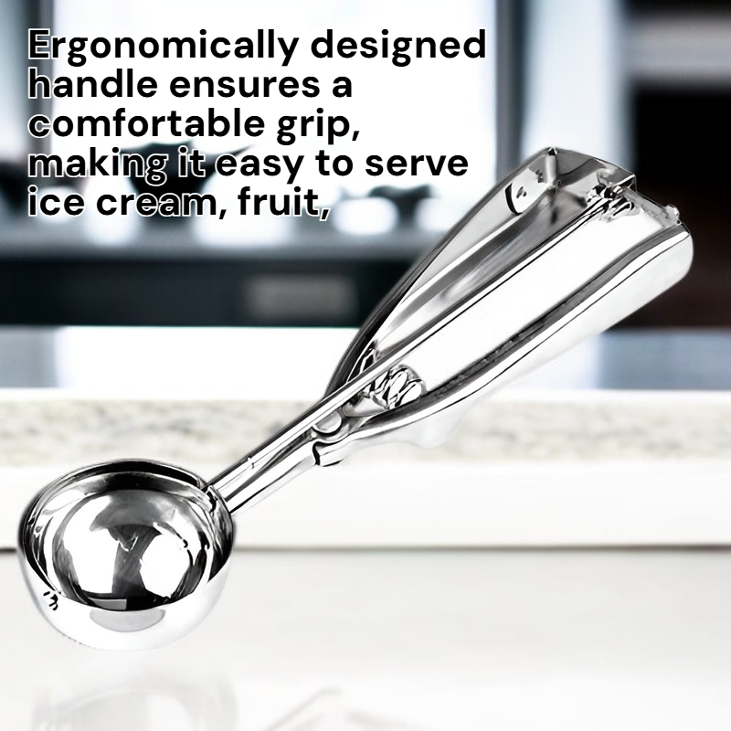 ● Ergonomically designed handle ensures a comfortable grip, making it easy to serve ice cream, fruit, or other desserts without slipping.